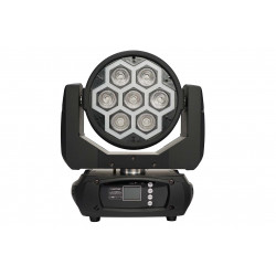 Cap mobil de spălare Moving Par Zoom, LED RGBW 4in1 de 28x12 wați, DMX 512 19/35 canale, mișcare Pan/Tilt pe 16 biți, zoom liniar electronic de 12-60 de grade, control grup de 4 pixeli, CTB și CTO 2800K-8000K modificabile, 0- Reglare 100% electronică, intrare/ieșire powercon, 6 kg.