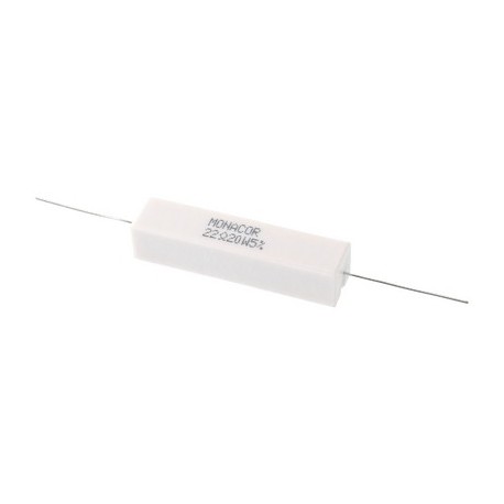 Rezistenta de putere Monacor LSR-220/20. Rezistente de ciment de mare putere, 20W. Rezistențe pentru utilizarea în rețelele încrucișate mai ales pentru aplicațiile PA și HiFi de top, de asemenea, pentru a fi conectate ca rezistențe de încărcare. Putere de putere 20W. Valoarea 22Ã ©