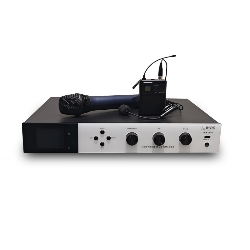 Amplificator digital pentru microfon wireless, 2 x 600w 8 ohmi, cu 2 microfoane wireless, portabil si bodypack cu casti, frecventa de operare 640 ? 690 MHz, procesor de efect ecou și reverbs, bulti în DSP cu control PC prin software, player Bluetooth, player USB, împerechere IR pentru microfoane, ieșire sub, funcționare 8ohm sau 4 ohm, presetări difuzoare, intrări și ieșiri HDMI.