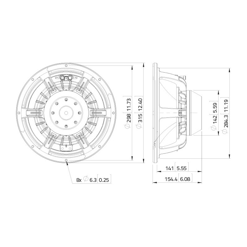 500 W AES, 8 ohmi, 99 dB, 50-3000 Hz
