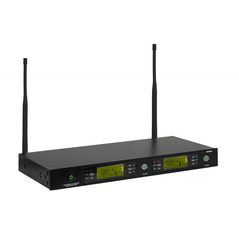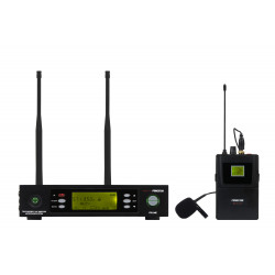 CARACTERISTICI: Receptor dublu True Diversity cu 2 microfoane clip-on cu capsulă condensator electret unidirecțional și 2 transmițătoare wireless cu centură.
