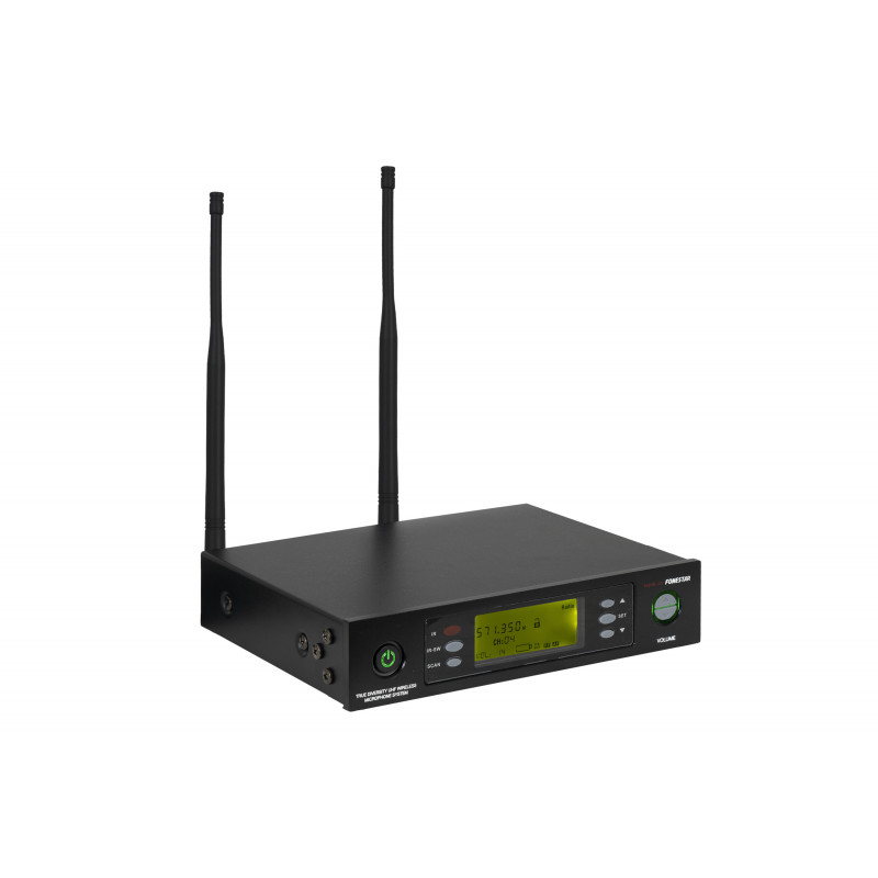 Are 32 de canale selectabile de la 631 la 645 MHz, cu funcție de scanare automată și transmisie a canalului la microfon prin IR.