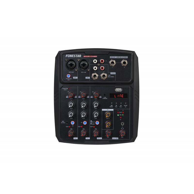 Are o dimensiune foarte mică și portabilă, perfectă pentru interpreți stradali, studiouri de muzică acasă, evenimente mici sau petreceri etc. În plus, necesită doar o sursă de alimentare de 5V DC, 2.1 A, care poate fi furnizată de adaptor, de către Port USB al unui PC sau laptop sau printr-un power bank, ceea ce crește foarte mult versatilitatea și posibilitățile de utilizare a acestui mixer complet.