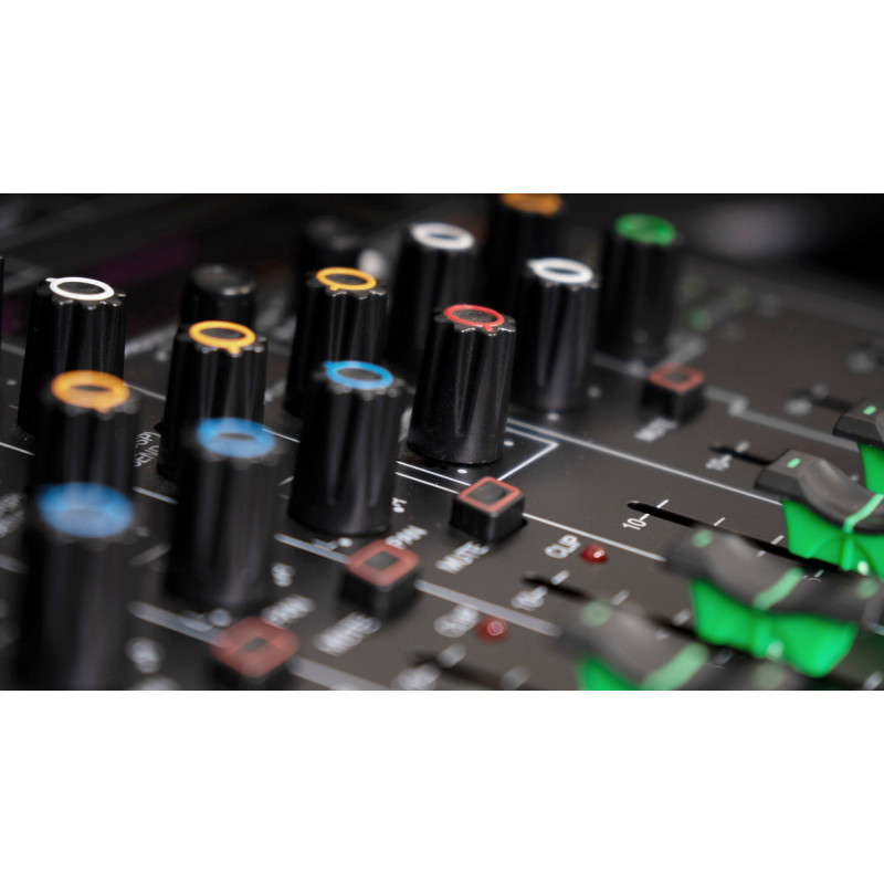 CONTROALE: Microfon/linie: filtru low-cut (18 dB/octavă, 75 Hz), câștig, bas (±15 dB, 80 Hz), mediu (±15 dB, 2.500 Hz), înalte (±15 dB, 12.000 Hz) ), Aux/EFX send, pan, mute and slide volume control