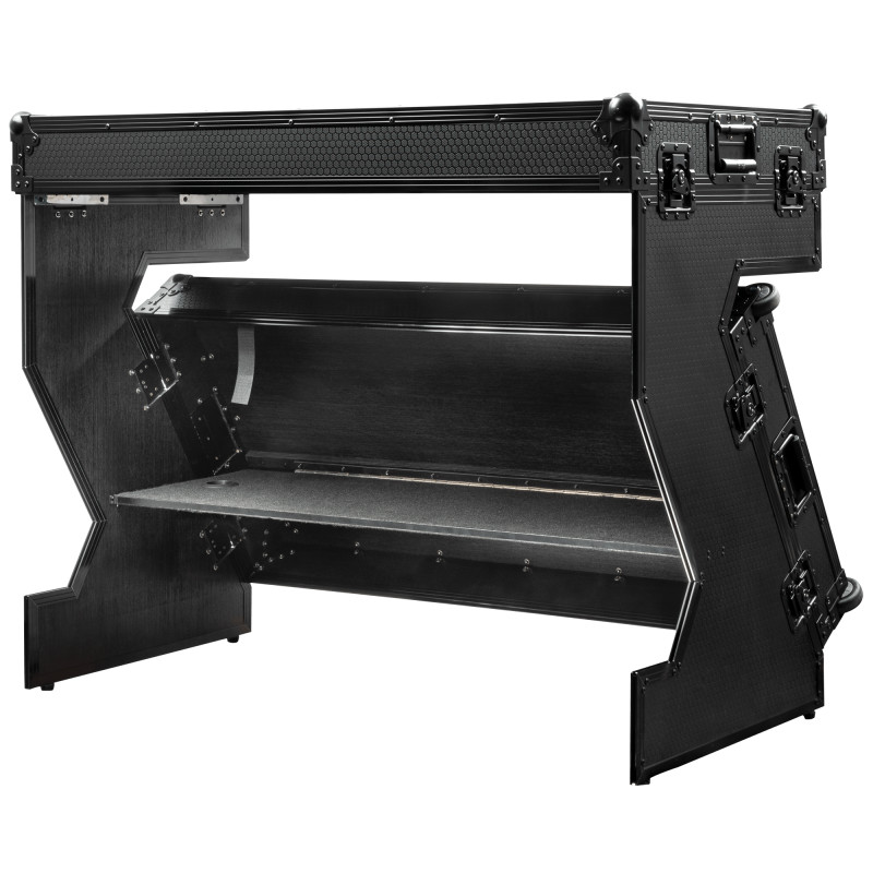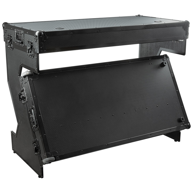 Masa portabilă Showgear în stil Z este o soluție versatilă, pliabilă, care se transformă perfect într-o cutie de transport robustă. Masa portabilă în stil Z este ideală ca masă pentru DJ, dar este și foarte utilă ca masă pentru console audio și de iluminat și poate fi folosită chiar și la târguri și expoziții. Configurația unică în stil Z a mesei permite unei jumătăți a cutiei să servească drept blat spațios, în timp ce cealaltă jumătate întărește picioarele și dispune de un raft util pentru echipamente și depozitare suplimentare. Blatul include două orificii pentru cabluri pentru o gestionare ușoară a cablurilor, asigurând un spațiu de lucru curat și organizat.