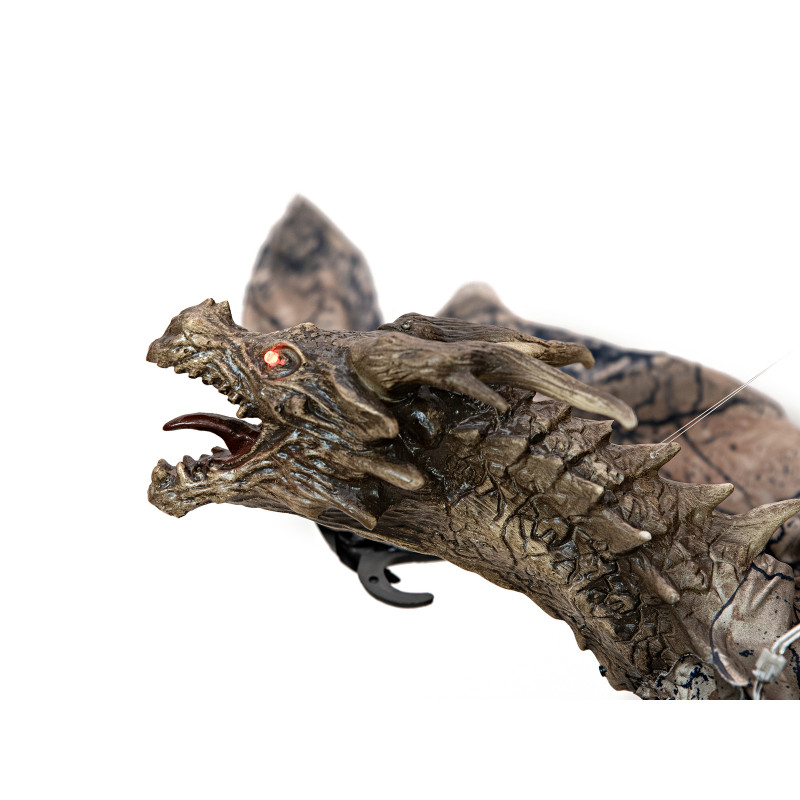 Pe baza imaginilor binecunoscute din mitologie, dragonul ține cu ochii pe pradă cu gura larg deschisă. Pentru a vedea mai bine împrejurimile sale, își mișcă capul la stânga și la dreapta. În același timp, aripile sale efectuează mișcări de zbor animate cu o gamă respectabilă de până la 120 cm - ceea ce înseamnă că aici ar trebui să se asigure suficientă libertate de mișcare. Se aude un sunet ciudat și țipete puternice și ascuțite, în timp ce un LED roșu clipește în fiecare dintre ochii lui. Snururile subțiri de nailon servesc drept suspensie.
