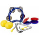 Set de instrumente de percuție populare pentru copii. Setul include o tamburină mică cu bețișoare, o pereche de ouă de plastic care zdrăngănește, mici castanete de plastic și un triunghi cu ciocan. Uneltele sunt realizate în culori luminoase și vesele. Aceste instrumente de percuție dezvoltă abilitățile muzicale și motorii ale copiilor.