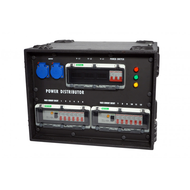 Rack distribuitor de energie CEE, dimensiune: 6U, 1 x 5PIN 63A intrare / ieșire CEE, ieșire 12 x 3PIN 16A, ieșire 2 x 3PIN 16A, întrerupător Delixi, ampermetru de tensiune, capac IP67 pentru a proteja întrerupătorul, clasificat IP: IP44.