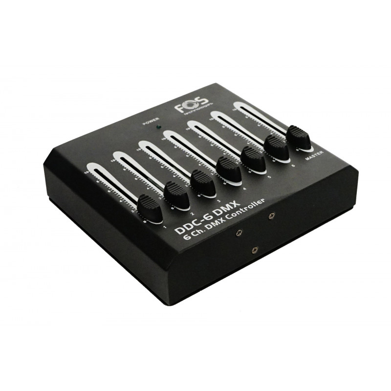 Controler Dmx cu 6 canale, 6 fadere de canale individuale și un fader master. 6 canale DMX. Design compact și funcționare simplă, ieșire DMX: conector DMX mamă XLR cu 3 pini.