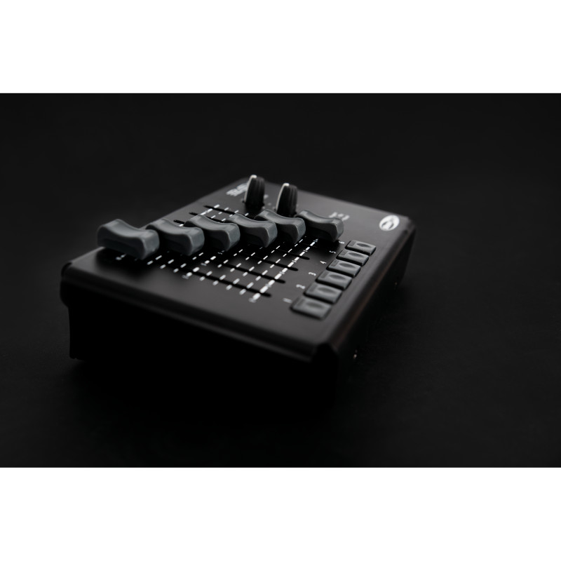 Showtec Easy 6 este un controler DMX compact, cu 6 canale, cu 6 fadere, 6 butoane cu LED-uri integrate, un buton de mod, un buton rotativ de estompare și un buton de reglare master. Este ideal pentru situații cu configurații simple de lumină, cum ar fi expoziții sau magazine mici, sau pentru echipele de scenă pentru a testa echipamentele DMX. Cu mânere integrate și 2 fante de montare, Easy 6 poate fi folosit în diferite moduri. Scenele pot fi stocate pe fiecare dintre butoane, iar LED-urile integrate indică dacă o scenă de redare este stocată sau nu pe un buton. În modul manual, faderele setează valorile dimmerului, în modul redare, scenele stocate sunt scoase la ieșire când butoanele sunt apăsate și în modul program, apăsarea unui buton stochează valoarea faderului. Partea laterală a controlerului are un comutator DIP care face posibilă schimbarea adresei de pornire a celor 6 canale. Controlerul poate fi alimentat cu USB-C sau 3 baterii AA.