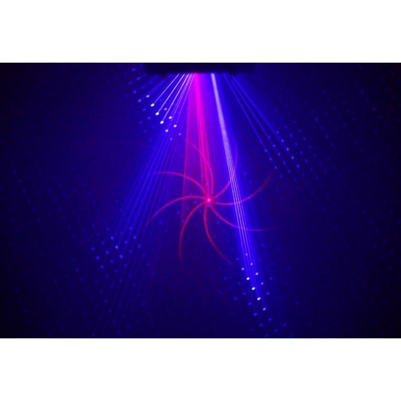 Laser rosu si albastru, 10 canale DMX. Unghiul de imprastiere a luminilor este mai mare de 70°. Moduri de functionare: master/slave, dupa sunet sau mod automat. Ideal pentru utilizari mobile, trupe, cluburi de noapte, baruri si alte petreceri etc.