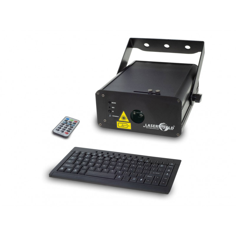 Laser cu lumină albă si multicoloră, cu funcționare plug & play și control ILDA și DMX, proiectând grafică de animație, text, fascicul în aer, valuri și efecte de tunel. Furnizat cu telecomandă și tastatură pentru text live și emisiuni programabile.