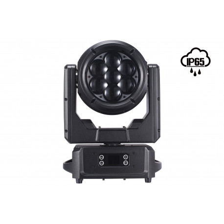 Cap mobil Wash/Beam hibrid versatil, cu protecție IP65, control pixeli, zoom, efect multifasci/caleidoscopic și inel exterior RGB pentru un efect optic suplimentar.