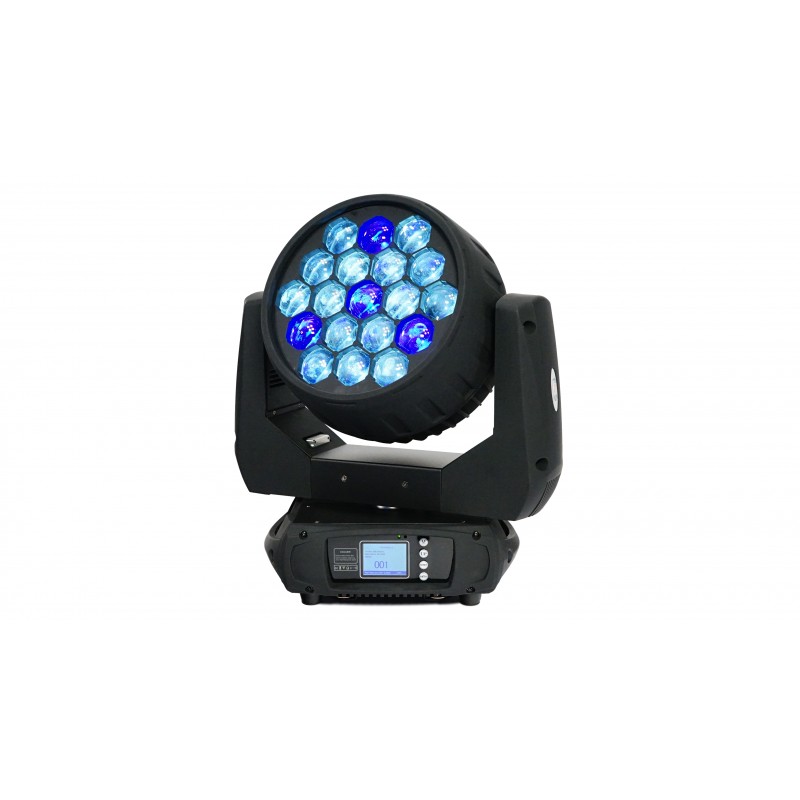 Cap de mișcare / spălare de grindă, 19 LED-uri RGBW 30w 4in1 zoom 6-60 °, 4 secțiuni control pixel, Macro-uri color prestabilite RGBW amestecând cu sau fără controler DMX, afișare TFT. Sursa de lumină / Optică