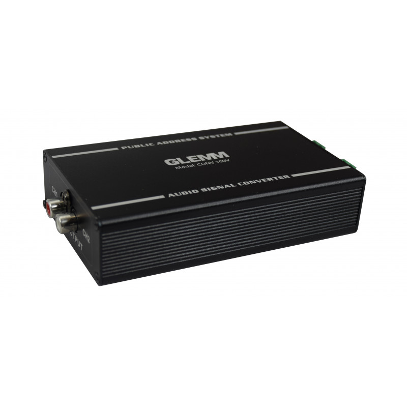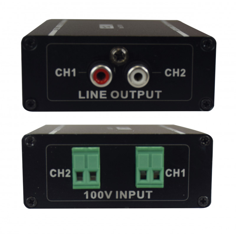 Convertor capabil să preia 2 semnale de 100V și să le transforme în tot atâtea semnale de linie prin intermediul conectorilor RCA.