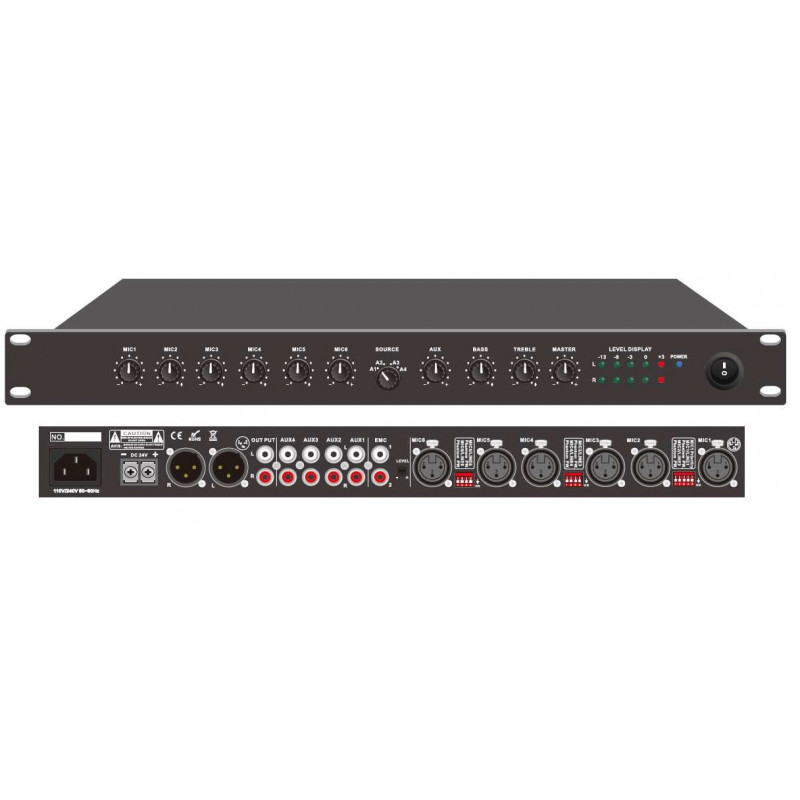 Mixerul stereo poate alimenta 6 intrări echilibrate mic/line și alte 4 intrari auxiliare, plus o intrare pentru un sistem de alarmă vocală.