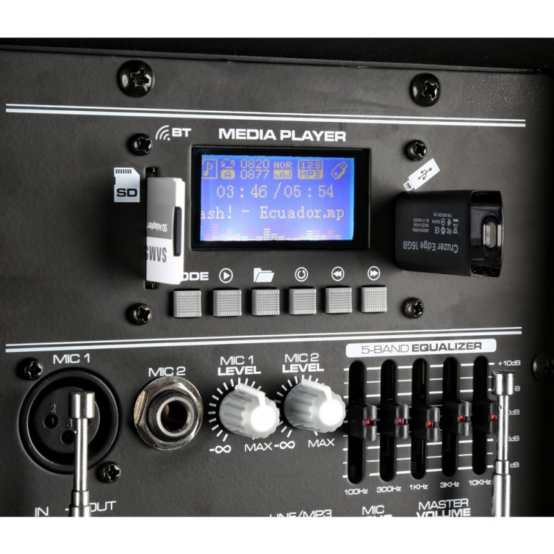 Sistem de sunet profesional 12" 200W, mobil, dispune de doua microfoane fara fir VHF pe frecvente diferite, telecomanda, intrare USB si SD pentru MP3. Toate acestea intr-un singur sistem care functioneaza pe baza unui acumulator de 12V.