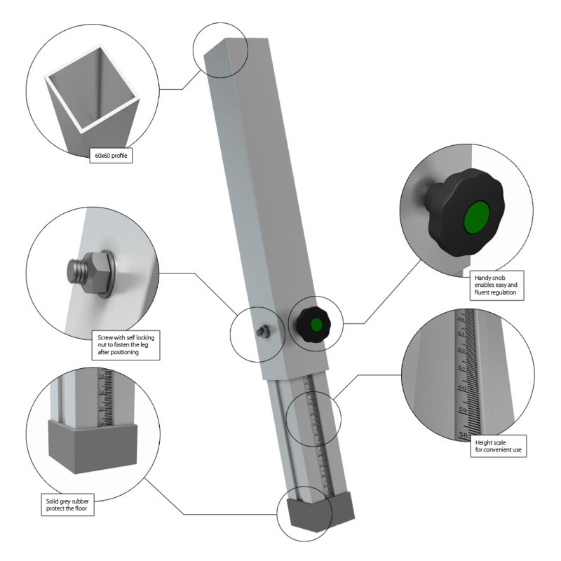 Picioare telescopice profesionale 40cm-60cm, profil 60x60, scară de înălțime, șurub autoblocant, cauciuc gri.